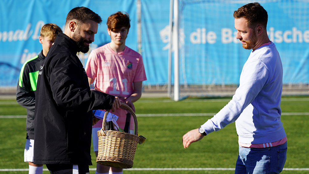 Simon erzählte, dass die Mannschaft des IUFC letztes Jahr gegen die U17 der Stuttgarter Kickers gespielt habe. Ein besonderes Highlight für seine Jungs. „Wir haben uns gedacht, was könnte die nächste Stufe sein?“ Daraufhin habe er bei den Sechzger angefragt. „Ein wunderschöner Verein mit so viel Geschichte, so viel Leidenschaft, so viel Kultur.“ Er hätte im Leben nicht gedacht, dass er überhaupt eine Antwort bekomme. „Für uns ist das ein Privileg, heute hier zu sein“, stellte Simon klar, der als Jugend- und Heimerzieher arbeitet. Er überreichte Stegmaier einen Präsentkorb mit Dingen, die in der Paulinenpflege produziert wurden.