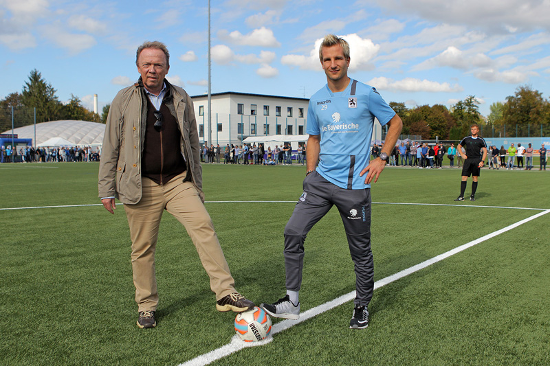 Zur Einweihung des neuen Kunstrasens wurde gemeinsam eine Spendentafel aufgehängt. Die Namen aller Spender, die mit ihren Gaben die Erneuerung des Kunstrasens unterstützten, sind darauf verewigt. Präsident Peter Cassalette und Profi Stefan Aigner, der selbst im Löwen-NLZ ausgebildet wurde, eröffneten offiziell den Platz mit einem symbolischen Anstoß des Spiels der U15.